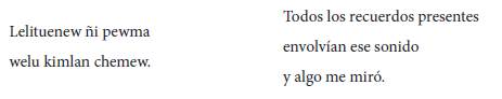 Los siguientes tres versos involucran en paralelo en cada versión del texto bilingüe al pewma o sueño y a los recuerdos como la instancia desde la cual el locutor percibe las imágenes representadas. El pewma, entendido en toda su complejidad, no implica solo el sueño que se experimenta al dormir, sino que también "corresponde [...] a las experiencias que nosotros llamamos soñar, soñar despierto, pensar, imaginar y sentir emociones" (Nakashima 182), con lo cual la memoria ancestral y el sueño como viaje que el alma realiza al encuentro de los antepasados (García Barrera, "El pewma") resonará a lo largo de todo el poema. Los misterios del mundo onírico se presentan en un nuevo antagonismo entre los textos, en tanto, el "algo" indeterminado que mira al locutor poético en la versión castellana sí tiene un nombre concreto en mapudungun: el pewma mismo lo observa, lelituenew, y esto provoca un estupor que no es expresado en castellano pero que tiene su propio verso en mapudungun: "welu kimlan chemew" que puede traducirse como "pero no sabía por qué".