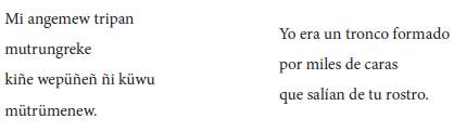 La revelación se produce en la siguiente estrofa en donde el propio sujeto poético se ve a sí mismo como un tronco que emerge del rostro de la madre. El contraste semántico y sintáctico entre los versos plantea aquí un complejo juego de palabras e imágenes. En primer lugar, en castellano el tronco se forma por miles de caras que, a su vez, salen del rostro materno. En mapudungun el hablante poético dice emerger o salir, tripan, de ese rostro "mi angemew", como un tronco mutrungreke pero no se hace mención a aquellas "miles de caras" del texto castellano. En lugar de esta referencia que podría estar vinculada a los ancestros de la rama materna, que se inscriben en el rostro de la madre y por ello también conforman al sujeto poético, los versos pares en mapudungun introducen una imagen que, al referirse a las generaciones futuras, contrasta y complementa la del texto español: "kiñe wepüñeñ ñi küwu / mütrümenew", literalmente, "la mano de un recién nacido me llamó" o bien "me sacudió".