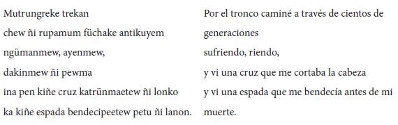 Este trayecto está acompañado por el sufrimiento y la risa: "sufriendo, riendo" tiene su verso par en "ngümanmew, ayenmew"; sin embargo, el texto en mapudungun contrasta nuevamente con el castellano al incluir un verso no traducido en su contraparte: "dakinmew ñi pewma", que incorpora otra faceta del trayecto intergeneracional: la celebración del sueño. Dakin o shakin, significa "honrar, respetar, apreciar" (Augusta 209), lo cual señala la relevancia cultural del pewma en su potencia visionaria y conectiva de los individuos con los planos superiores de la espiritualidad. Las imágenes que luego se suceden frente a la vista del locutor-testigo hacen referencia al tema de la conquista y colonización y se constituyen en "experiencias heredadas" (García Barrera, "Entretextos" 37-38): la bendición de la espada y la sentencia mortal de la cruz, como dos símbolos de la sujeción impuesta desde el poder civil y eclesiástico por los conquistadores a los ancestros del sujeto poético.