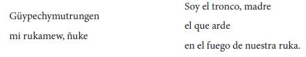 El cierre del poema no declina en la línea de complejidad semántica mantenida durante todo su desarrollo y los versos de la última estrofa ofrecen juegos de palabras que retoman los ya planteados. En castellano, el sujeto poético vuelve a asimilarse a la imagen del tronco pero, esta vez, como aquel que arde en el fuego de la ruka u hogar materno. Esta última referencia no es casual si tenemos en cuenta que el fogón, como sitio alrededor del cual las familias mapuche se reúnen a compartir recuerdos, consejos, sueños, historias y cantos, tiene una enorme carga simbólica en la conformación de los vínculos filiales, así como de la propia identidad como parte de una familia y una comunidad. Esto tiene que ver con el propio nombrarse y configurarse como persona; tal idea se expande con el reenvío semántico aportado por el texto mapudungun al introducir la expresión Güypechymutrungen en el penúltimo verso. Güy, es "el nombre" (Augusta 237) y güypechi podría comprenderse como una forma adverbializada adherida al sustantivo mutrung, tronco y al verbo ngen, ser, algo así como "soy tronco nombrado", o "soy por nombre tronco". El cierre del poema en lengua mapuche destaca la acción de nombrarse y de esta manera definir el propio lugar en el orden social. La voz poética parece referirse a la construcción de la imagen del poeta como el encargado de dar calor y luz a la memoria ancestral, tarea que se le ha confiado en los sueños y se le ha transmitido en la intimidad de un fogón familiar.