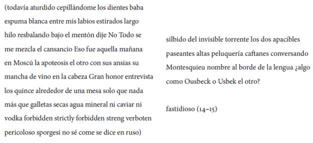 Pese a que el agenciamiento escénico, series de palabras incluidas (empezando por el título), funcionó como detonador, no es este acto el todo de referencia para el texto que se escribe. El espectador-autor se dedica, recurriendo a sus propias palabras, a establecer relaciones entre diferentes momentos de su experiencia personal reciente -y solo algunos de estos momentos tienen estrictamente que ver con la presentación teatral que él acaba de presenciar-. El espectador-escritor traza por escrito una línea que atraviesa acontecimientos heterogéneos.34 Dentro de este despliegue múltiple y sin centro, se dedica él a explicitar lo que produce sentido y lo que, al contrario, remonta a una ausencia de sentido.35