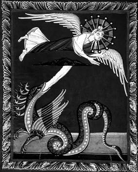 Para el hombre medieval los animales fabulosos son imágenes del diablo, como es el caso del dragón y el basilisco, "el mundo animal es, sobre todo, el universo del mal" (Le Goff 299). Esta idea fue difundida por los bestiarios a partir del Fisiólogo, pero su principal inspiración, para el caso del dragón, fue la Biblia. En este libro, el diablo solamente aparece en forma de dragón, imaginado todavía como una serpiente al comienzo de la era cristiana, en el libro del Apocalipsis (a finales del siglo i d. C., aproximadamente),14 esta es la base más importante para la visión de este monstruo como imagen del mal en Occidente. La Biblia describe, entre muchas otras figuras, a una mujer embarazada "vestida del sol, con la luna debajo de sus pies y sobre su cabeza una corona de doce estrellas" (Apoc. 12:1) y "un gran dragón escarlata que tenía siete cabezas y diez cuernos, y en sus cabezas tenía siete diademas" (Apoc. 12:3). También se menciona una guerra en el cielo entre los ángeles liderados por Miguel y los ángeles rebeldes que se unieron al dragón, "la serpiente antigua, que se llama Diablo y Satanás" (Apoc. 12:7-9) (ver imagen 3). Estos últimos caen derrotados. El Apocalipsis puede verse como otra imagen de la antítesis del régimen diurno, en el que se identifica a lo puro y la sombra con la salvación (Jesús) y el pecado (Satán), respectivamente. El significado del dragón radica en la concepción del diablo dentro de los textos neotestamentarios.15 En estos textos, el diablo "opera como un contraprincipio de Cristo. El mensaje central del Nuevo Testamento es la salvación: Cristo nos salva. Y nos salva del poder del diablo. Si se descarta el poder del diablo, la misión salvadora de Cristo pierde sentido" (Burton et al. 230).