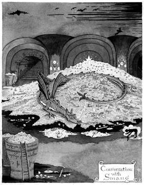 Los dragones de Tolkien, al igual que los héroes que les dan muerte (Bardo, Turín y Eärendil) están inmersos en un mundo imaginario que adapta ciertos elementos de la tradición épica germana (Cáceres 174). En El Hobbit, la primera novela de Tolkien, el dragón alado Smaug custodia, dentro de la llamada Montaña Solitaria, el tesoro que le arrebató a los enanos más de cien años antes, compuesto por "incontables pilas de preciosos objetos, oro labrado y sin labrar, gemas y joyas, y plata que la luz teñía de rojo" (Tolkien, El Hobbit 221) (ver imagen 8). Esto evidentemente se asemeja al caso de Fafnir, bajo cuya imagen se configurarán todos los dragones de Tolkien (Cáceres 188), y al dragón del poema Beowulf. Este último, según comentó Tolkien en 1938, inspiró el episodio del robo de la copa dorada de Smaug, por parte Bilbo Bolsón, protagonista de El Hobbit, y la venganza del dragón hacia el pueblo de Esgaroth (Carpenter, Cartas 54-55).
