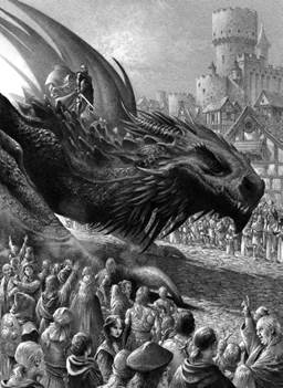 Imagen 10: Martín, George R. R. "Aegon I el Conquistador, primer rey Targaryen, sobre Balerion". Fuego y Sangre, Ciudad de México, Penguin Random House, 2018, pág. 62.
