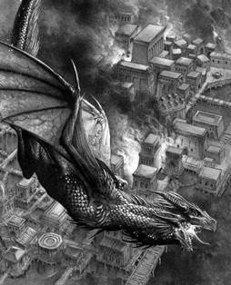 Imagen 9: Wayne Hammond y Scull Christina. "Glórund sale en busca de Túrin". J. R. R. Tolkien. Artista e ilustrador, Barcelona, Minotauro, 1995, pág. 51.