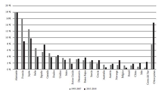 No obstante, para el periodo 2013-2018, observamos un aumento exponencial de los países hispanohablantes, que reduce la distancia entre Buenos Aires, México y San Pablo, y justo detrás Bogotá y Santiago de Chile. Caracas y, más generalmente, Venezuela, ceden así la plaza a Bogotá y a Colombia. Estos efectos de centralización o multipolaridad también se observan en la edición en general: se trata, en gran parte, de un puro reflejo de la geografía del mercado mundial de la edición (Sapiro, "Mondialisation et diversité culturelle").