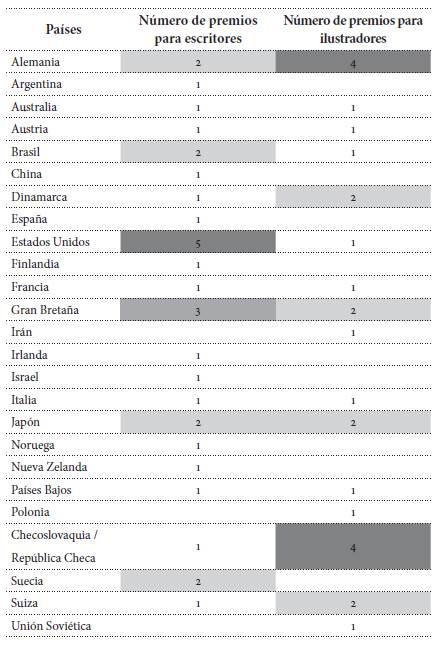 Tabla 1: Premio Hans-Christian Andersen por nacionalidad de los autores e ilustradores. Premios otorgados desde 1956 (escritores), y 1966 (ilustradores)6