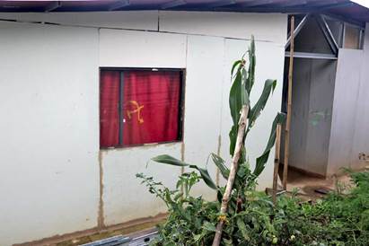Figura 2: Una bandera comunista como cortina de una de las viviendas en el ETCR