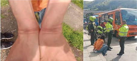 Carolina, la mamá de mis hijos, me empujaba para el apartamento cuando vio que se acercaba otra patrulla para detenernos a todos. (…). El chico siguió grabando; nosotros tratamos de regresar a la casa (para recoger los celulares y grabar), pero no pudimos cuando vimos que subieron al chico a la patrulla, a punta de patadas; estábamos muy atemorizados porque ayer, una chica de 17 años, en Popayán, se suicidó después de que, al parecer, abusaron de ella en medio de una detención arbitraria. Con la mamá de mis hijos comenzamos a gritar, y la gente salió por las ventanas, salieron de sus apartamentos y grabaron algunas cosas. Compartí con un comité de derechos humanos de la localidad los videos que grabó una vecina. Según las averiguaciones, estas chicas y el chico fueron detenidos bajo la figura de Traslado por Protección del actual Código de Policía Nacional. (Diario de campo 4)