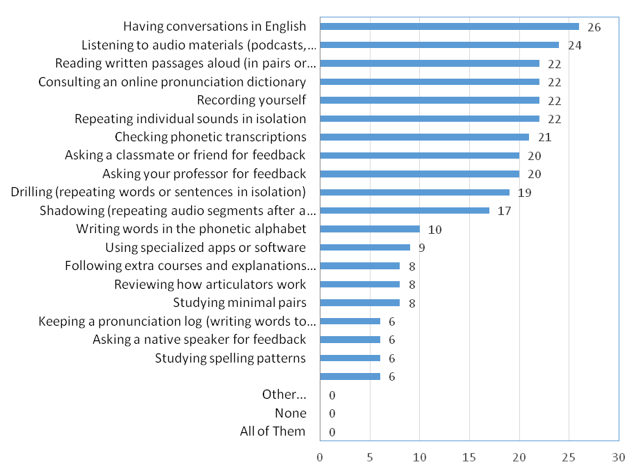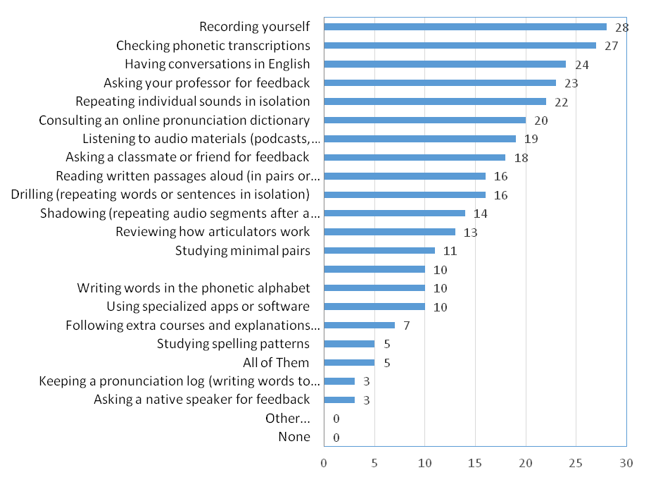 This analysis provided insight into students’ perceptions of pronunciation study habits. The findings also revealed which aspects were more salient or less popular, as well as the amount of time students devoted to improving their pronunciation outside of class.