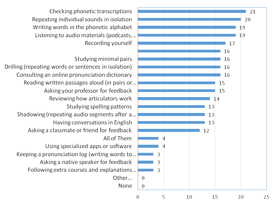 As before, students ranked the study habits recommended in the syllabus or the course anthology. As Figure 2 shows, no pronunciation study habits reached 75% (n ≥ 25) of opinions. The second series of answers falls between 50% and 74% (n ≥ 17, ≤ 24) and emphasize metalinguistic components like checking phonetic transcriptions and writing words in the phonetic alphabet together with repeating individual sounds in isolation and listening to audio materials. Interestingly, for example, recording yourself ranked first in professors’ recommendations but barely surpassed the 50% (n = 17) of opinions here. The third set of recommendations (between 25% and 49%; n ≥ 9, ≤ 16) includes eleven pronunciation study habits. This correlates with the perception students have regarding the incorporation of pronunciation study habits in course materials. Only following extra courses and explanations, asking a native speaker for feedback, keeping a pronunciation log, and using specialized apps or software received less than 25% (n ≤ 8) of recognition. Three of these activities are again at the bottom of the list of recommended pronunciation study habits. Similar to our previous analysis, four students mentioned that professors had recommended all the habits listed; however, no student mentioned a habit not listed in the questionnaire.