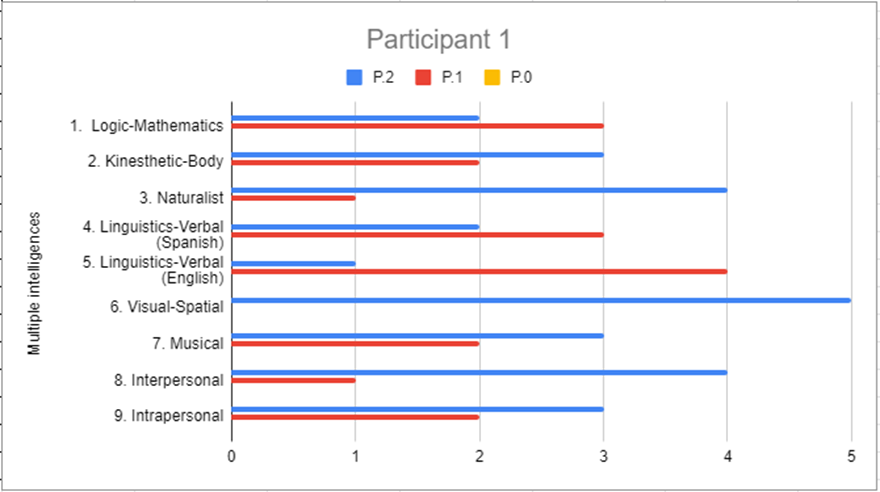 El participante dos obtuvo un desempeño emergente. Las inteligencias preeminentes fueron la naturalista y musical. Las inteligencias inter e intrapersonal se ubicaron en el percentil más bajo. En estas últimas, el estudiante requirió apoyo por parte de las docentes y compañeros de clase para ejecutar las actividades. Durante el desarrollo del dp, se evidenció que el estudiante tenía conocimientos generales de varias áreas. Aun así, requirió más tiempo terminar las tareas. Al realizar las actividades, no mostró interés genuino en completar las que estaban relacionadas con sus inteligencias menos dominantes.