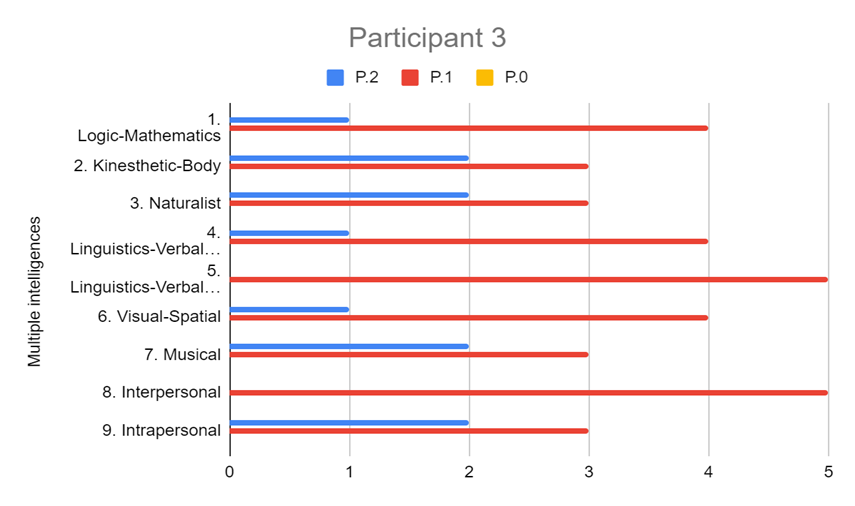 El participante tres obtuvo un desempeño en nivel de suspenso. Se evidencia que el educando destacó en las inteligencias matemática y musical. Las inteligencias interpersonal y lingüística-verbal en inglés se situaron en el percentil más bajo. En el dp, el estudiante requirió ayuda de las docentes y compañeros para desarrollar las actividades de estas dos últimas inteligencias, las cuales fueron las menos preponderantes en este educando.