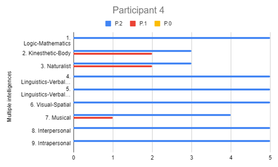 El participante cuatro se ubicó en nivel aprobado. Se observa que el niño destacó en las inteligencias lógico-matemática, lingüística verbal, visual-espacial, inter e intrapersonal. En el dp, este estudiante manifestó gran disposición y rapidez a la hora de completar las actividades. A lo largo de la intervención, el niño tuvo un rendimiento académico prominente. Las inteligencias cinestésica corporal y musical se ubicaron en el percentil uno. Se denota la importancia de planear una estrategia que contribuya a la promoción de las inteligencias dominantes del estudiante. Así, el proceso adquisitivo del icle podrá complementarse con la interdisciplinariedad de la propuesta y las habilidades del estudiante.