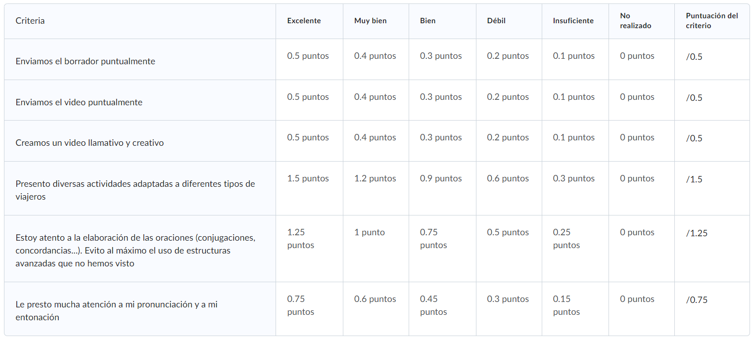 En lo relacionado con la distribución de porcentajes de los criterios de evaluación, cada uno tuvo un valor diferente, establecido a partir de las rúbricas de los exámenes certificativos internacionales del DELF. De esta manera, las competencias lingüísticas representaron un valor máximo de 45% del total, siendo la habilidad gramatical la más importante de esta competencia. Por su parte, la competencia pragmática fue la que tuvo el valor más elevado de todas. Las rúbricas se presentaron de dos formas: la primera de una manera visualmente atractiva, para llamar la atención de los estudiantes respecto de los criterios y sus porcentajes (Figura 2). La segunda se dio de forma más interna, en la plataforma digital de la universidad, que permite la creación y el uso de rúbricas para la evaluación e incluye los diversos niveles de puntuación (Tabla 2). Las rúbricas fueron presentadas en francés a los estudiantes, pero se traducen al español en la Figura 2 y la Tabla 2. El proyecto asociado a los ejemplos de rúbrica es el de “Proponer un recorrido de visita en una ciudad francófona para diferentes tipos de viajeros” (primer proyecto). Como se puede observar, los tres primeros criterios (puntualidad y creatividad) se evalúan grupalmente, mientras que los tres últimos (competencias pragmática, gramatical y fonética) son de carácter individual.