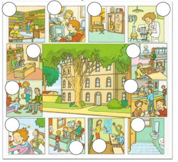 Se sensibiliza a los estudiantes con esta imagen para tratar el tema de la descripción de una escuela. Los estudiantes deben reflexionar en cada cuadro de la imagen que se muestra qué lugares se observan y qué actividades desempeñan los personajes. Figura 1. Actividad 1