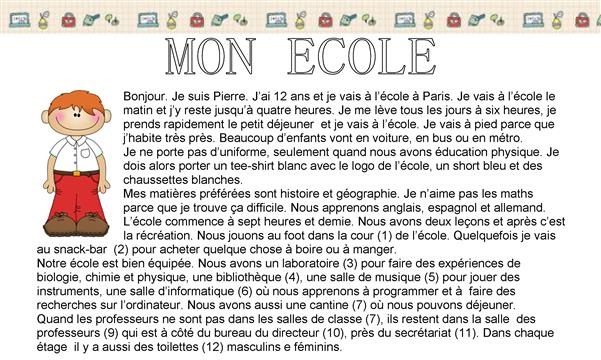 Mon école Dans cette école il y a sept cents élèves et une_______________ ___ ______, il y a beaucoup d’_____________ ___________et scolaire pour les élèves, Il y a une __________, un ___________, un petit magasin et une chapelle. J’aime bien mon école, les profs sont ________, __________, consciencieux, parce qu’ils travaillent très dur et ils expliquent très bien. Il y a aussi des profs qui sont trop __________parce qu’ils nous grondent tout le temps. Mon école est assez ________, c’est un vieux bâtiment, elle est située au centre-ville, c’est une _________ ____ ________, dans ___ _______, il y a vingt-huit garçons. On fait du sport ici, il y a toutes sortes d’________. On joue au rugby, au basquet, au hurling. Après les cours l’école nous offre un grand choix de ______et de _________ : un club d’________, une société de _________. Barrez l’intrus 1. Uniforme – tee shirt – tableau – short-jeans 2. Matière – histoire – pizza – géographie – Maths 3. Leçons – classe – études – professeurs – paysage 4. École équipée – laboratoire – machine à laver – bibliothèque – gymnase 5. Salle de musique – salle d’informatique – jouer des instruments – salle de professeurs 6. Cantine – cheveux – déjeuner – pause 7. professeurs – sévères – sympa – sportifs – chaussure |