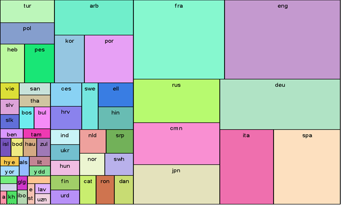Dans la moitié droite du schéma on trouve huit langues dont six sont d’origine européenne, l’arabe apparaît en neuvième position, mais, comme pour le classement des langues officielles, il s’agit le plus souvent de l’arabe écrit.