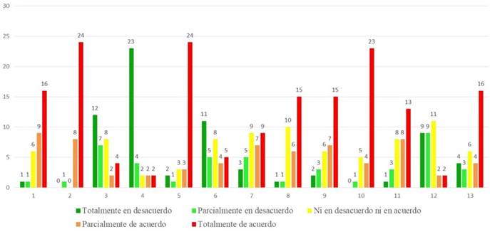La Figura 3 resume los resultados obtenidos en el test de este primer momento. Por el lado de las abscisas se encontrarán las 13 preguntas respectivas, mientras que en las coordenadas se hallará la cantidad de estudiantes acumulados para cada pregunta.