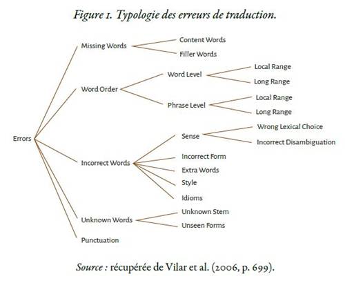 Diverses classifications typologiques des erreurs sont possibles. Les recherches dans le domaine de la TA peuvent être classées notamment en trois grandes catégories : (1) les typologies d'erreurs au niveau linguistique qui permettent de classer les erreurs dans les sorties des systèmes (Farrus et al., 2010 ; Lommel et al., 2014 ; Vilar et al., 2006) ; (2) les typologies d'erreurs au niveau de la traduction (Koponen, 2010) ; (3) les typologies visant la métrique et la qualité du texte (Lommel & Melby, 2018). Certains travaux (Lommel et al., 2014 ; Vilar et al., 2006) portent notamment sur des typologies d'erreurs au niveau linguistique. Ainsi, Vilar et al. (2006) identifient cinq catégories principales d'erreurs de traduction, à savoir les mots absents ou non traduits, l'ordre des mots, les mots incorrects (mauvais choix lexical ou mauvaise désambiguïsation), les mots inconnus et le non-respect de la ponctuation de la langue cible ainsi que des sous-catégories. Vilar et al. (2006) dressent également la Figure 1 :