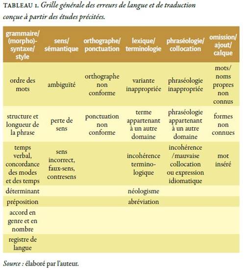 Pour leur part, Farrus et al. (2010) dressent une typologie des erreurs linguistiques les plus fréquentes dans le domaine de la TA. Cette classification est essentiellement d'ordre orthographique, morphologique, lexical, sémantique et syntaxique, chaque catégorie comprenant aussi des sous-catégories. Dans sa recherche, Koponen (2010) met l'accent sur les aspects sémantiques et propose une première typologie qui se base sur six catégories d'erreur : le concept est omis ; le concept est ajouté ; le concept n'est pas traduit ; le concept est mal traduit ; le concept est substitué et le concept est expliqué. À cette classification de base viennent s'ajouter les concepts d'omission ou d'ajout : le participant est omis ou ajouté ; la relation est omise ou ajoutée en raison d'erreurs morphosyntaxiques ; le participant ou la relation n'est pas identique ; le participant ou la relation a été substitué(e). Ces normes sont censées veiller à la cohérence et la clarté d'une traduction.