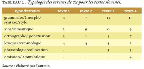 Nous reproduisons dans le Tableau 2, sur la base du Tableau 1, la typologie des erreurs obtenues à partir de la TA des quatre textes slovènes traduits vers le français.