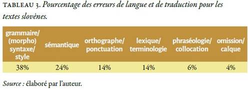 Le Tableau 3, ci-dessous, indique le pourcentage des erreurs de traduction, tous textes compris.