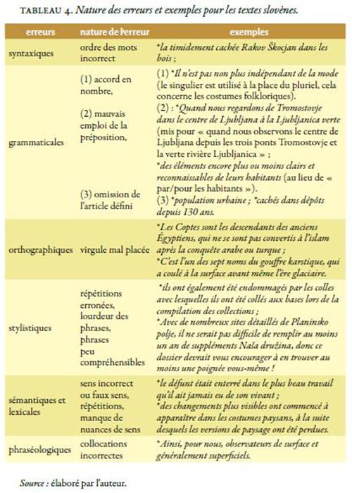 Il apparait que les erreurs les plus fréquentes dans le texte 1 (article de presse sur les tissus coptes) concernent l'erreur syntaxique, à savoir l'ordre des mots, et l'erreur lexicale pour les répétitions de termes et le manque de nuance de sens. Dans le texte 2 (présentation internet de l'exposition du Musée national - la collection des tissus coptes), les erreurs les plus fréquentes s'appliquent aux erreurs syntaxiques (l'ordre des mots), stylistiques (lourdeur des phrases) et sémantiques (sens incorrect et faux-sens). Pour le texte 3 (texte touristique - présentation de la région karstique Planinsko polje), l'erreur grammaticale (problème de déterminant et emploi de la préposition) apparait le plus souvent. Sur le plan sémantique, le système de TA a commis le plus de faux-sens. Enfin, dans le texte 4 (l'article sur l'histoire des costumes traditionnels slovènes), les erreurs relatives à la syntaxe et la stylistique (lourdeur des phrases, omission de l'article, phrase incompréhensible) sont les plus fréquentes. Sur le plan sémantique, le système de TA a commis le plus d'erreurs de faux-sens et sur le plan orthographique, les virgules et les points sont omis ou mal placés. La traduction est, quant à elle, littérale.
