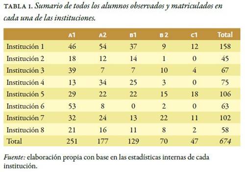 Todos los centros contaban con niveles de principiantes, intermedios, y avanzados, no obstante, solo tres de ellos contaban con una escala comparativa estandarizada al Marco Común Europeo de Referencia para Lenguas, por lo que en el presente artículo se agruparán todos los centros de acuerdo al MCER con el fin de establecer homogeneidad entre la variación de etiquetado de los niveles en los diferentes centros. No obstante, es importante aclarar que la homologación está en función de los contenidos que se enseñan en cada nivel, y no en relación con la competencia individual de cada estudiante, por ende, una banda del MCER corresponde de tres a cinco niveles institucionales. La Tabla 1 presenta un sumario de todos los alumnos observados y matriculados en cada una de las instituciones.