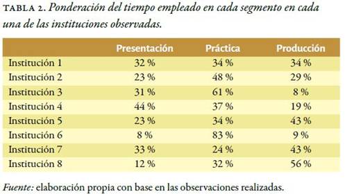 Ahora bien, todas las instituciones siguen un modelo que se puede resumir en tres segmentos, estos son: presentación de los contenidos de la sesión, práctica de los contenidos bajo esquemas controlados, y producción libre de lenguaje bajo ciertos parámetros contextuales. Encontramos que en cada uno de estos segmentos se pueden agrupar una serie de técnicas utilizadas por los profesores que estarán en función de la metodología institucional y los objetivos de cada sesión; además, se lograron encontrar patrones en cuanto al tiempo que se emplea en cada uno de estos segmentos. En la Tabla 2 mostramos un sumario del tiempo promedio utilizado por cada institución.