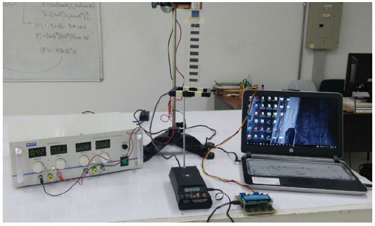 Se dispusieron todos los elementos (Figura 5) de tal forma que cada vez que se interrumpid el flujo de corriente en el electroimán, la reja caía libremente a través de las dos Fotocompuertas, ambos Timer se colocaron en modo GATE, en el cual los sistemas cronometran el tiempo de sombra a través de ellas, únicamente de la primera franja que detectan; el ancho de la franja utilizada fue de 10mm.
