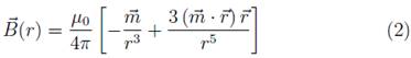 Para ello, estudiaremos la señal recibida por las dos configuraciones de bobinas de detección. Para el análisis supondremos que la muestra se comporta como un dipolo magnético puntual, oscilando en presencia de las bobinas de detección. Para un dipolo puntual, la ecuación 2 muestra el campo magnético producido cuando su momento magnético es m y muestra la distancia al mismo [7].