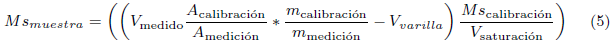 Para obtener como resultado las curvas de histéresis en emu/g se necesita calibrar nuevamente el MMV; para ello usamos una muestra patrón de composición Fe 3O4 (magnetita) de 26,5 mg, y con un momento magnético de 92 emu/g [9]. Primero se obtuvo el ciclo de histéresis de la muestra patrón con el MMV, luego se ajusto mediante cálculos numéricos las mediciones de forma que el momento magnético final sea de 92 emu/g (Mscalibración). También se ajusto la medida con la masa de calibración (mcalibración), que es la masa de la magnetita. La ecuación de calibración es la siguiente: