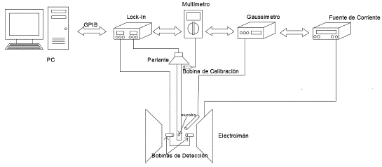 En el extremo superior de la varilla no magnética se fija un iman permanente, cerca de una bobina llamada bobina de calibración de la oscilación. El voltaje inducido por el imán permanente sobre esta bobina se suele emplear para mantener la amplitud y la frecuencia de oscilación constante; de esta forma, la señal medida sólo depende del momento magnético de la muestra. Sin embargo, nosotros la utilizaremos como método de calibración de la medida, mas no para mantener constantes la amplitud y frecuencia. Las constantes de calibración se obtienen mediante la medida de una muestra patrón con momento magnético conocido. El campo magnético uniforme es aplicado mediante un electroimán que está conectado a una fuente de corriente que permite variar el valor del campo. El campo magnético generado por el electroimán se mide mediante un gaussímetro que posee un mecanismo de control por realimentación de bucle cerrado llamado PID (Proporcional, Integrativo, Derivativo) [4]. Todos los elementos están interconectados con el PC mediante un interfaz GPIB y con ayuda del software de programación gráfico, diseñado específicamente para aplicaciones de prueba y medición Agilent VEE Pro (Visual Engineering Environment) [5], se ajusta para ejecutar el proceso especificado anteriormente. En la figura 2, se muestran las conexiones y el lugar de colocación de los elementos del MMV.