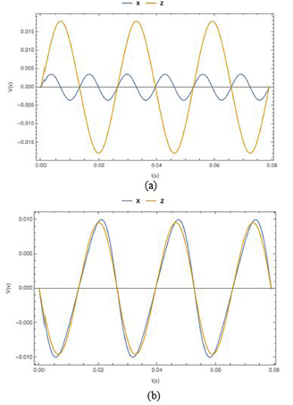 Observamos en la figura 5a que es mayor la fuerza electromotriz producida en el eje z, siendo además de la misma frecuencia que la de oscilación. Este resultado indica que las bobinas de detección se deben colocar en forma vertical, puesto que es en esa forma que se obtiene mayor fuerza electromotriz inducida. Por otra parte, observamos en la figura 5b que la fuerza electromotriz producida en el eje z y en el eje x son similares. Este resultado indica que las bobinas de detección se podrían colocar de forma vertical o de forma horizontal, puesto que se obtiene aproximadamente el mismo voltaje inducido de las dos formas.