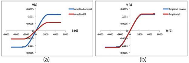 La señal percibida por las bobinas de detección depende de la amplitud de oscilación de la muestra. Cada vez que se cambie de muestra, frecuencia o amplitud, la señal será diferente, para eliminar esta dependencia debemos calibrar la medida de la señal de salida mediante la amplitud de oscilación con la muestra patrón (Magnetita). En la figura 10(a) se observa que, si la muestra oscila con menor amplitud, la señal percibida por las bobinas de detección también es menor. Para eliminar esta dependencia, a la señal medida por el lock-in la multiplicamos por la amplitud de calibración (Acalibración) que será la amplitud de oscilación con la muestra de magnetita y la dividimos por la amplitud de oscilación que se tenga en cada medición (Amedición), es decir, la amplitud que medirá el multímetro, de forma que si se cambia la muestra y/o se varía la amplitud, se compensa esa variación.
