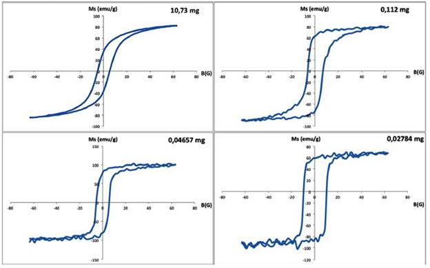 Se observa en la figura 13 que, para una muestra de permalloy de masa mayor a 10 mg, se tiene un ciclo de histéresis muy bien definido, sin ruido importante y con un momento magnético de 84 emu/g, valor dentro del intervalo esperado comparado con los datos encontrados en la bibliografía [11]. Para la muestra de 0,1 mg, el ciclo de histéresis comienza a perder su forma, siendo el ruido apreciable, aunque el ciclo aún es reconocible. Para la muestra de 0,04657 mg, el ciclo de histéresis se deforma, aunque todavía tenga forma apreciable; los valores de Ms distan mucho de los comparados con la bibliografía. Finalmente, para muestras de 0,02784 mg, existe mucho ruido y el ciclo de histéresis está muy deformado, variando en gran cantidad la medida del momento magnético en comparación con las anteriores mediciones. De las anteriores medidas estimamos que el ruido presente en ellas es del orden de 0.05 emu en cualquiera de ellas, por lo que resulta razonable requerir que la mínima señal que podemos medir deber ser un orden de magnitud mayor, por tanto de 0.5 emu.