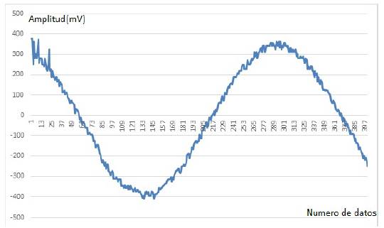 Para corroborar el correcto funcionamiento de la tarjeta digitalizadora, se obtuvo la cantidad de datos que conforma un ciclo de la señal; analizando la Figura 5, se puede concluir el inicio y fin de dicho ciclo, por lo tanto, se tiene que el inicio del ciclo se da en el dato 55 y el fin en el dato 372, obtenidos estos valores se procede a realizar el cálculo de la cantidad de datos que viene siendo la diferencia entre ambos puntos, por lo cual su valor correspondiente es: