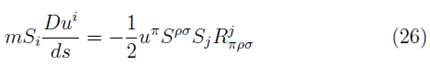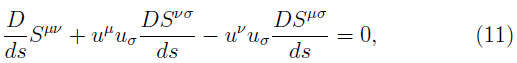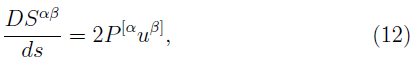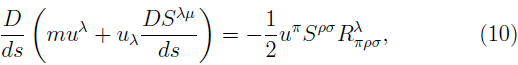 where the covariant derivative is given by D/ds, the antisymmetric tensor , S µv , R λ ϖpσ is the curvature tensor, and υ μ = dz μ /ds is the particle's four-velocity. We do not have the evolution equation for υ μ and it is necessary to single out the center of mass which determines the world line as a representing path and specifies a point about which the momentum and spin of the particle are calculated. The worldline can be determined from physical considerations [49]. In general, two conditions are typically imposed: The Mathisson-Pirani supplementary condition (MP) u σ S µσ = 0 [24,25] and the Tulczyjew-Dixon condition ρ σ = 0 [27]. We found that if we contract the equation
