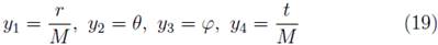 where y1 = r/M, y7 = Mu 3, y8 = u4, ε0 = |S0| /mr and α = α/M. When the particle does not have spin (ε0 = 0), the set of equations (10) with the dimensionless quantities y i (19) and (20) is given by