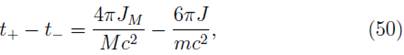 To check our results, we review the papers regarding gravitomagnetic clock effect [66] and compare their results with ours. The delay time given by the clock effect is t + - t_ = 4ϖα/c, where α = J/Mc is the angular momentum density of the central mass. Tartaglia has studied the geometrical aspects of this phenomenon [20,67], and Faruque yields the equation of the gravitomagnetic clock effect with spinning test particles as [8]