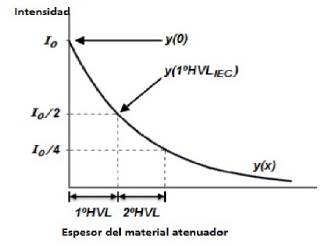 Para cada calidad de radiación, es necesario obtener una curva de atenuación, utilizando laminas atenuadoras de aluminio, de diferentes espesores, con un mínimo de pureza del 99.9 % y su espesor debe ser conocido con una incertidumbre máxima de ±0.01mm las dimensiones deben ser suficientes para interceptar la totalidad del haz de fotones. Estas láminas deben ser colocadas equidistantes del foco del tubo de rayos x y el detector. La determinación de la curva de atenuación es representada en la figura 5 y de esta curva podemos determinar los parámetros 1oHVL, el cociente y(1oHVL)/y(0) y el coeficiente de homogeneidad.