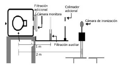 Para la determinación de la filtración adicional se siguió el procedimiento descrito en la (TRS) No. 457 [7]. La cámara se colocó a 2 metros del foco del tubo, la filtración auxiliar se colocó a 1 m seguida de un segundo colimador de 58 mm de diámetro.