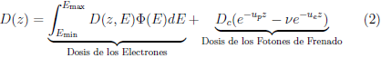 Dado que todo haz clínico de electrones posee cierta cantidad de fotones de frenado, producidos antes y después de colisionar con la superficie del fantoma de agua, la Ec. 1 debe ser modificada, adicionando la dosis de los fotones de frenado modelada mediante la fórmula semiempírica de Brahme & Svensson [17],