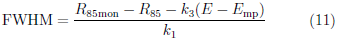 donde k 1 y k 3 son constantes, R 85mon es el rango terapeutico de la distribución de dosis en profundidad correspondiente al haz monoenergetico de energía nominal de 6 MeV y R 85 es el rango terapeutico de D*.