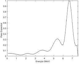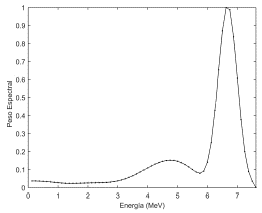 La energía mas probable del espectro de energía se localizo en 6,625 MeV mientras que la anchura a media altura del pico fue de 0,76 MeV.