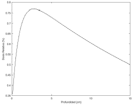 En la Fig. 3 se muestra la dosis de los fotones contaminantes para el haz de energía nominal de 6 MeV. Su forma es parecida a la de haces de fotones de rayos-X de alta energía: una región de build-up seguida por una región de caída lenta.