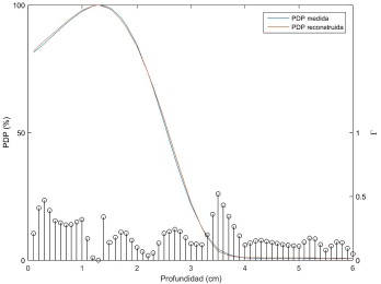 En la Fig. 4 se presenta la comparación entre la PDP reconstruida a partir de la simulación Monte Carlo del espectro reconstruido, utilizando el parámetro de regularización óptimo, y la PDP medida en el fantoma de agua.