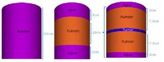 Los objetos simuladores usados en este trabajo son: un objeto simulador homogéneo de pulmón con densidad igual a 0.32 g/cm3 con geometría cilíndrica y dimensiones de 20 cm de altura y radio de 7,5 cm, además de dos objetos simuladores heterogéneos (agua, pulmón), la densidad del objeto simulador de agua es 1.03 g/cm3.