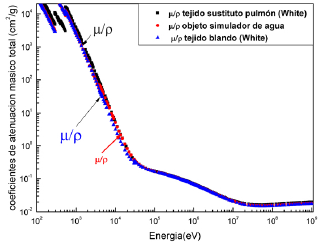 Para las curvas en la figura 2 se utilizó la composición porcentual por peso del tejido blando y del tejido substituto de pulmón del artículo de White 5, en el cual describe la composición porcentual por peso para diferentes materiales.
